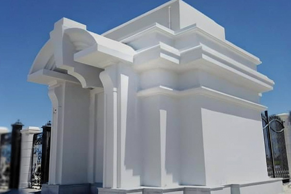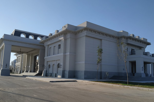 The scope included the main and annex buildings, five private villas, security gates, fence columns, and landscape features. We executed 4,000 m² of fiber cement boards across the façades and 8,000 m² of GRC for decorative cornices, cladding, and columns.